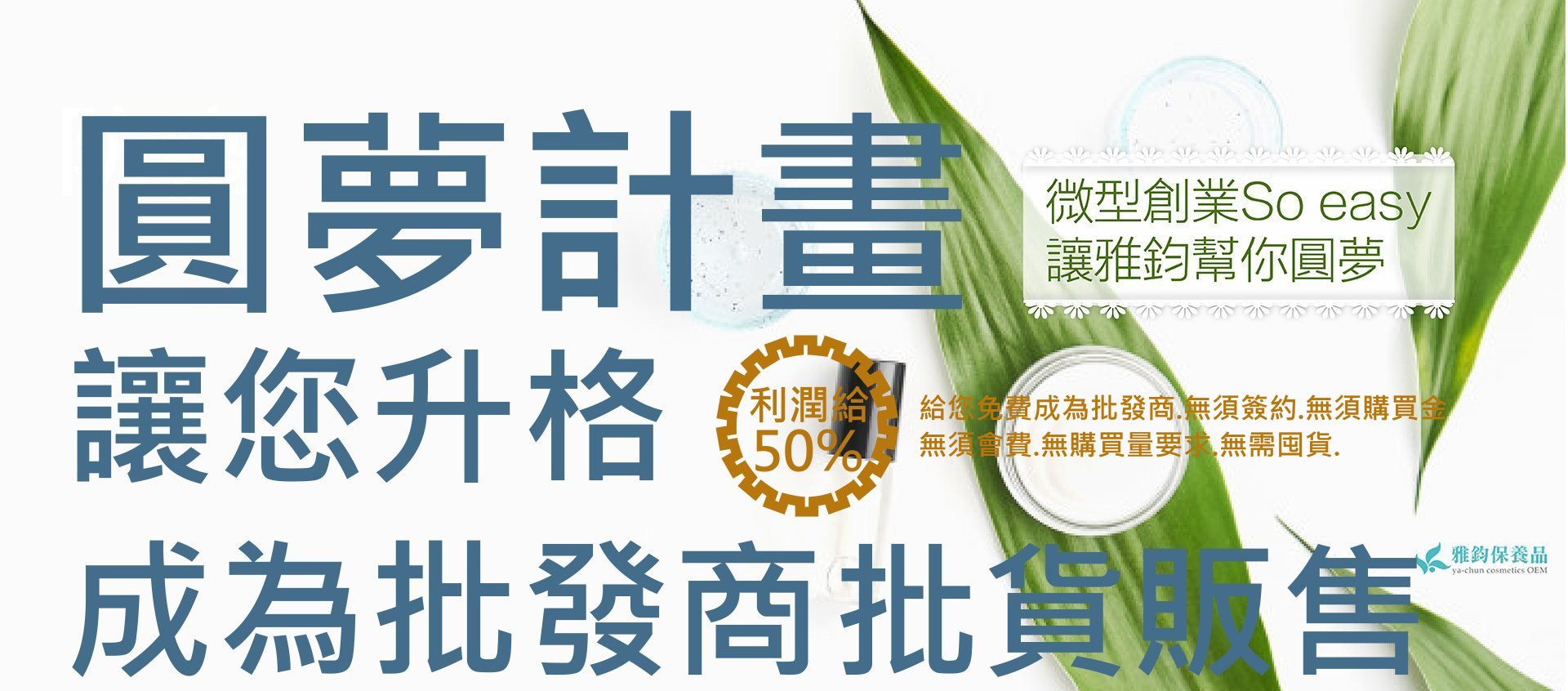 圓夢計畫:經銷商.只要您有銷售或行銷經驗和規劃周全的Proposal行銷企劃書,我們經過審核如果及格,我們會全力幫助您從品牌開發代工,到完整的上架行銷,讓您成為我們的經銷商,就可以(享有經銷商福利和網路行銷資源,並提供產品開發生產、廠登、廠字號使用)。