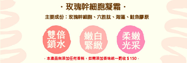 這瓶玫瑰幹細胞凝霜,質地溫和不刺激,具有活化肌膚,並能提升肌膚使用後的彈性與柔嫩,為肌膚提升延緩老化的能力,持續修復肌膚令嫩白功效倍增,使肌膚持久保濕、改善老化、暗沉等問題,重現肌膚柔嫩光采。