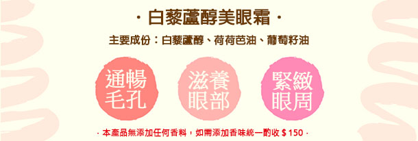 白藜蘆醇美眼霜能夠保濕、滋養眼部周圍嬌嫩細緻的肌膚,撫平細紋、緊緻眼周肌膚、防止肌膚老化及調理黑眼圈並改善泡泡眼,促進肌膚活力,使雙眸年輕有神,同時,達到長效滋潤、保濕,減緩老化現象。