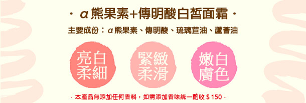 α熊果素 : 嫩白、改善暗沉的功效,並且穩定性良好,白天不易吸光,有補水的功效。