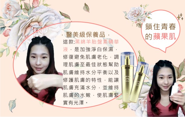 1.羊胎盤 :滋潤皮膚、防止皺紋產生。會讓臉部皮膚自然滲出需要的油分,不但容光煥發並且可防止乾燥,保持年青般的細嫩膚質。