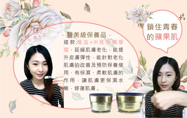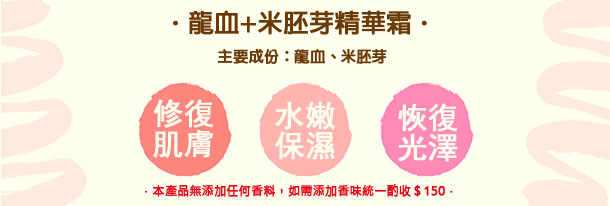 這款龍血+米胚芽精華霜,延緩肌膚老化,能提升皮膚彈性,加強肌膚的天然防護系統,能針對老化肌膚的改善及預防保養使用,有保濕、柔軟肌膚的作用,讓肌膚更保濕水嫩,修復肌膚