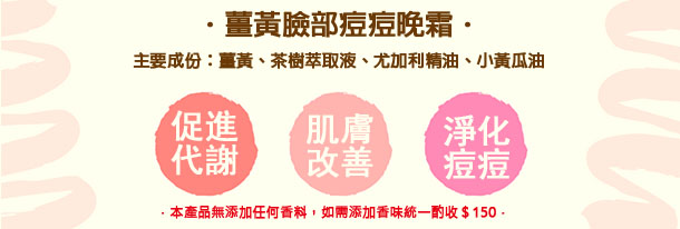 薑黃臉部痘痘晚霜因為它含有薑黃,可以預防肌膚的快速老化,另外也添加了茶樹萃取液跟尤加利精油,可以調理、淨化痘痘。 早晚使用約兩克左右,洗完臉後再擦,平時做保養用,也可以讓肌膚更有光澤跟彈性。