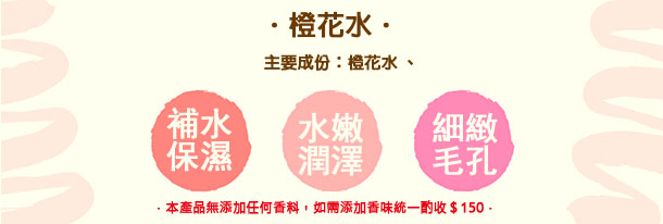 橙花水:延緩肌膚衰老現象、細緻毛孔平衡油脂、可紓緩肌膚乾澀,及令肌膚有光澤。