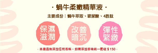 蝸牛萃取:有保濕以及撫平皺紋,使皮膚變得光滑。