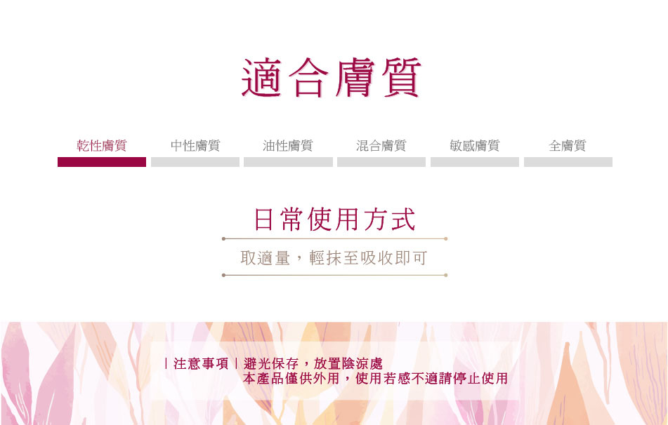 透過溫和的保養方式,來幫助肌膚達到亮白,具有良好的保濕、滋養,同時撫平皺紋,防止肌膚老化,舒緩肌膚,提升肌膚舒適度