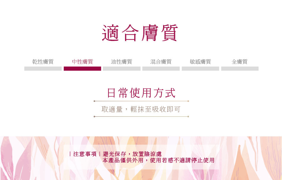 術後保養肌膚屬性乾性皮膚Dry Skin中性皮膚Normal Skin混合皮膚Combination Skin敏感膚質Sensitive Skin功能屬性保濕Moisturizing抗老緊實Anti-Aging滋潤Nourishing產品屬性眼部保養Eye Care醫美級保養品術後保養保濕淨白抗老緊實滋潤抗痘控油舒緩修護日間保養品夜間保養品保養級保養品沙龍級保養品醫美級保養品化妝水精華液