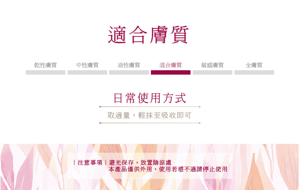 肌膚屬性乾性皮膚Dry Skin中性皮膚Normal Skin油性皮膚Oily Skin混合皮膚Combination Skin功能屬性淨白Whitening產品屬性特殊護理Special Care沙龍級保養品限時搶購特價區最熱銷產品特價區術後保養保濕淨白抗老緊實滋潤抗痘控油舒緩修護日間保養品夜間保養品保養級保養品沙龍級保養品醫美級保養品化妝水精華液