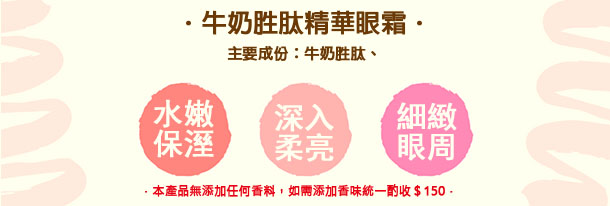 這款牛奶胜肽精華眼霜具有調理肌膚,幫助眼周肌膚改善,使肌膚留住水份、恢復肌膚彈性。