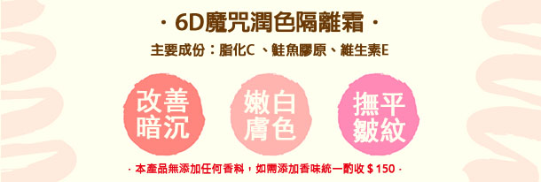 這款6D魔咒潤色隔離霜對於皮膚的滋潤性高,能保護肌膚,防止肌膚老化,增加肌膚防護力,預防乾燥環境對肌膚的傷害,能夠保濕滋潤肌膚,增加肌膚淨白、細嫩、恢復肌膚彈性。