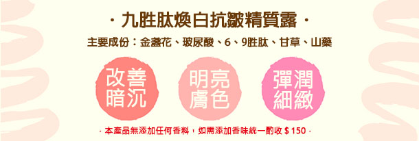 九胜肽煥白抗皺精質露能改善暗沉肌膚,淨白並明亮膚色,撫平肌膚皺紋,舒緩肌膚乾燥及改善肌膚的粗糙現象,使肌膚彈潤細緻。