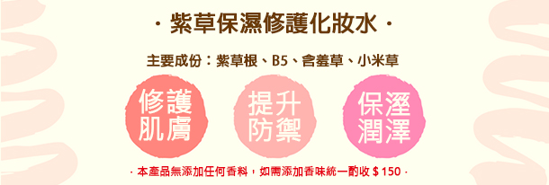 紫草根萃取精華:保溼、修護肌膚問題、提升防禦力。