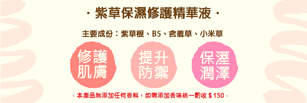 紫草根萃取精華:保溼、修護肌膚問題、提升防禦力。