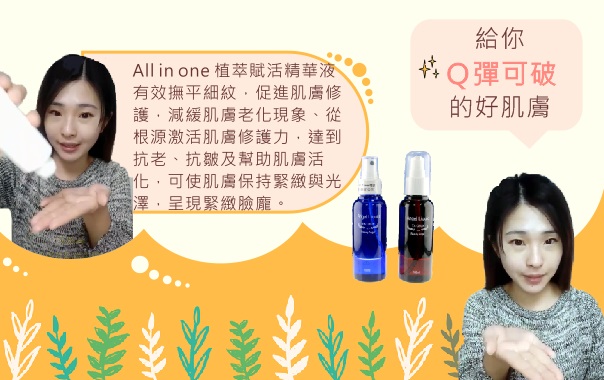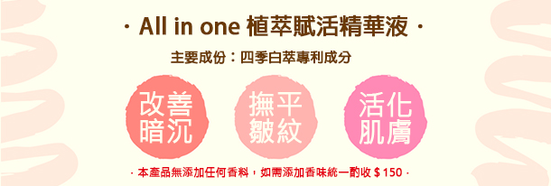 All in one 植萃賦活精華液有效撫平細紋,促進肌膚修護,減緩肌膚老化現象、從根源激活肌膚修護力,達到抗老、抗皺及幫助肌膚活化,