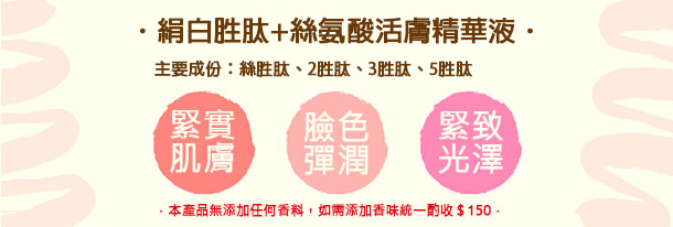 絲胜肽:易穿透皮膚角質,具彈性、鎖水、儲水功能,修護肌膚,使肌膚光滑細緻。