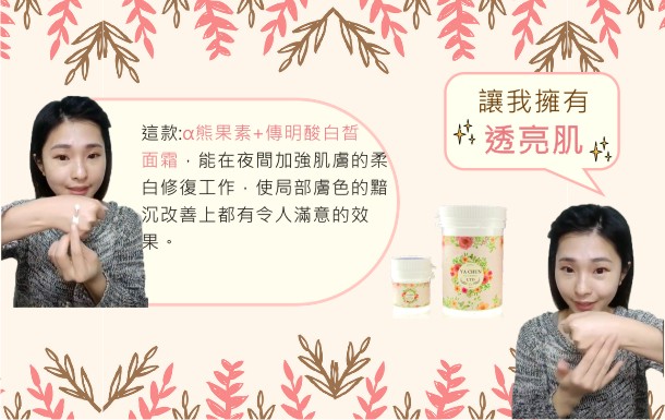 α熊果素 : 嫩白、改善暗沉的功效,並且穩定性良好,白天不易吸光,有補水的功效。