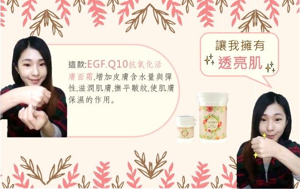 這款EGF.Q10抗氧化活膚面霜,增加皮膚含水量與彈性,滋潤肌膚,撫平皺紋,使肌膚保濕的作用。