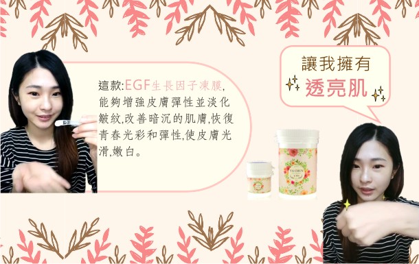 EGF生長因子:修護肌膚,改善皮膚暗沉以及撫平皺紋跟防止肌膚粗糙。