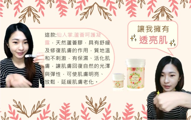 蘆薈:能平衡肌膚油脂分泌,讓肌膚緊緻柔滑,使肌膚有滋潤的作用,並能修復肌膚,使肌膚恢復健康。