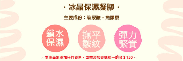 魚膠原 : 良好的保濕功效,能鎖水保濕淡化細小皺紋,延環肌膚老化,使皮膚緊致有彈性和光澤,補充肌膚所流失的水分。