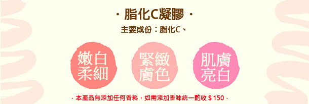 這款脂化C凝膠,成分較溫和,穩定性良好, 容易被皮膚所吸收,有淡化皺紋。延緩皮膚的老化,使肌膚亮白兼具減少老化,美麗功效!