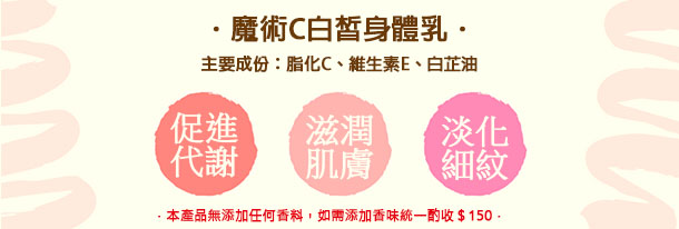 這款” 魔術C白皙身體乳,讓肌膚滋潤光滑有彈性,還有淡化膚色、淡化細紋。
