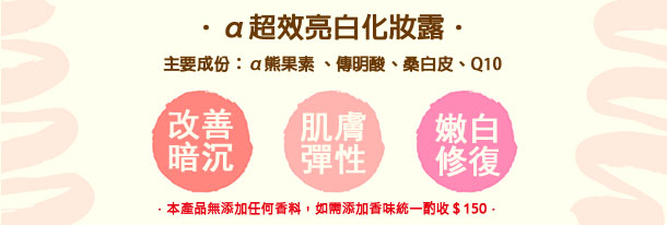 這款:α超效美白化妝露,能在夜間加強肌膚的嫩白修復工作,能改善臉部膚色不均,使肌膚呈現明亮狀態,且穩定性極佳,白天不易吸光,嫩白效能優異。保持皮膚彈性,鎖住大量水分子,具有保濕潤滑作用。
