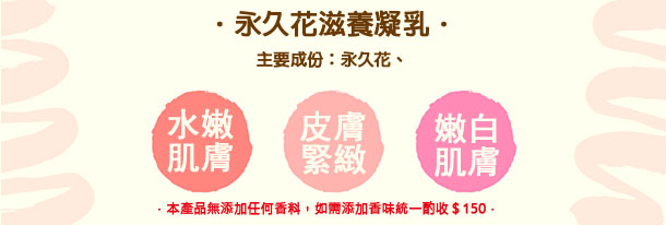 使用:永久花滋養凝乳會讓皮膚緊緻、收斂,有柔軟皮膚的功效,也能使皮膚柔白能改善暗沉,適合各種皮膚質使用。