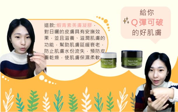 這款:蝦青素美膚凝膠,對日曬的皮膚具有安撫效果,並且滋養、滋潤肌膚的功能,幫助肌膚延緩衰老,防止肌膚水份流失,預防皮膚乾燥,使肌膚保濕柔軟。