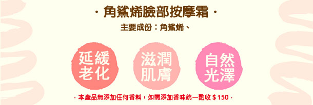 使用:角鯊烯臉部按摩霜來按摩,保濕、滋潤、防止肌膚老化,補充水分和提升皮膚防護力,使肌膚留住水分、滋養肌膚,展現肌膚自然光澤。