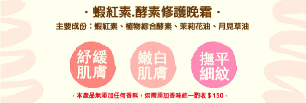 蝦紅素:防止肌膚老化,使肌膚受到陽光日曬的影響之後,紓緩肌膚光滑。