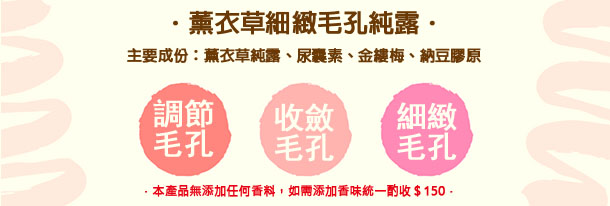 這款:薰衣草細緻毛孔純露,具有收斂、修復、安撫皮膚的效果,改善毛孔粗大,使肌膚呈現細膩、收斂毛孔、光滑、緊緻狀態、細緻毛孔。